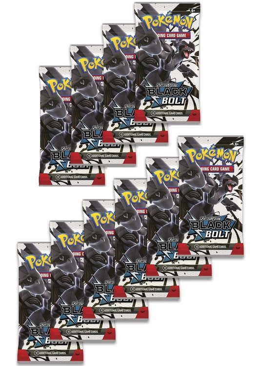 Du køber her 10 Booster pakker fra SV10.5 Black Bolt.Én booster pakke indeholder 10 forskellige pokemonkort fra SV10.5 Black Bolt og 1 kode du kan bruge til Pokemon TCG online.
