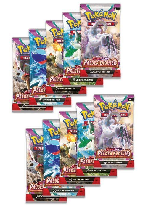 Du køber her 10 Booster pakker fra SV2 Paldea Evolved.Én booster pakke indeholder 10 forskellige pokemonkort fra SV2 Paldea Evolved og 1 kode du kan bruge til Pokemon TCG online.