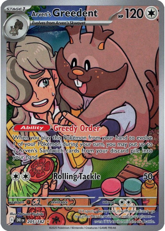 Arven’s Greedent er et Illustration Rare | Secret Rare pokemon kort fra SV10 Destined Rivals serien og har nummer 205/182.