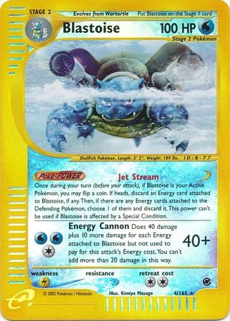 Blastoise er et Rare Holo kort fra Expedition serien og har nummer 4/165.