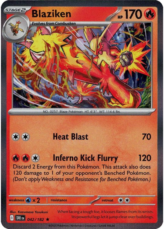 Blaziken er et Rare Holo Holo pokemon kort fra SV10 Destined Rivals serien og har nummer 42/182.