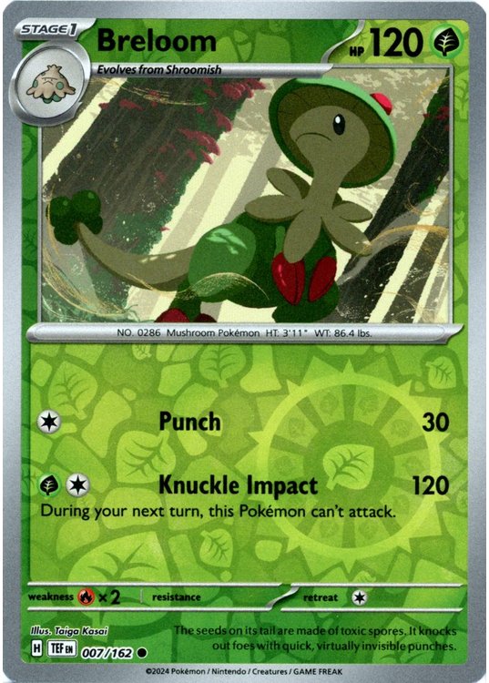 Breloom er et Common pokemon kort fra SV05 Temporal Forces serien og har nummer 7/162.