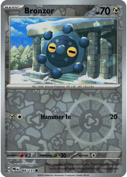 Bronzor er et Common pokemon kort fra SV08.5 Prismatic Evolutions serien og har nummer 66/131.