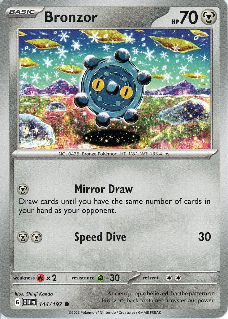 Bronzor er et Common pokemon kort fra SV03 Obsidian Flames serien og har nummer 144/197.