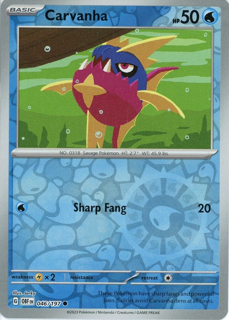 Carvanha er et Common pokemon kort fra SV03 Obsidian Flames serien og har nummer 46/197.