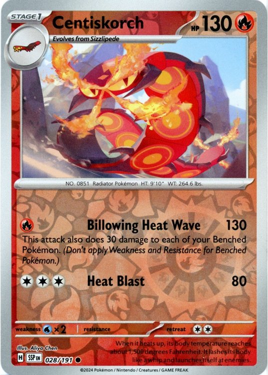 Centiskorch er et Common pokemon kort fra SV08 Surging Sparks serien og har nummer 28/191.