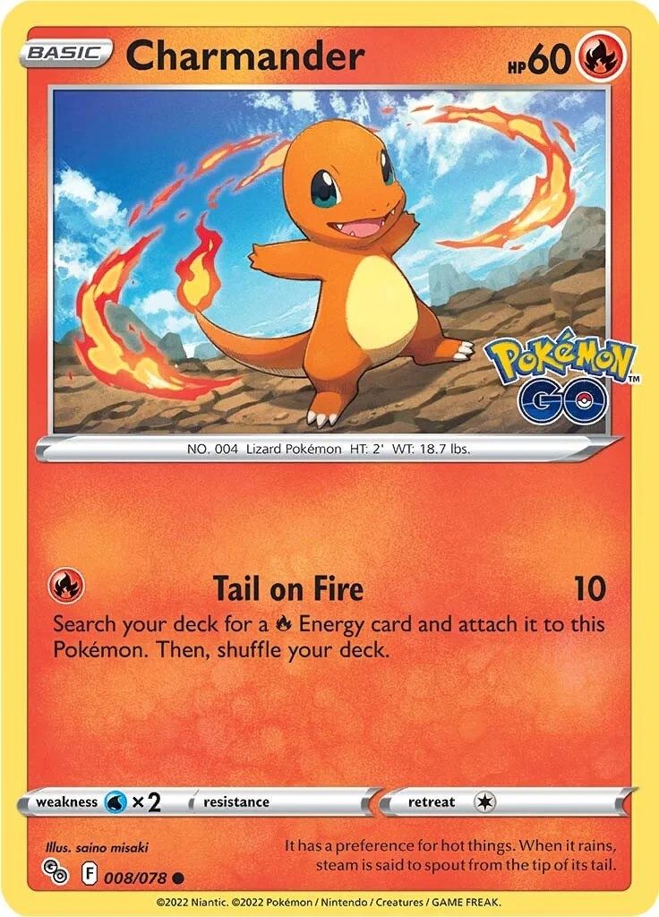 Charmander er et Common pokemon kort fra SWSH Pokemon GO TCG serien og har nummer 8/078.