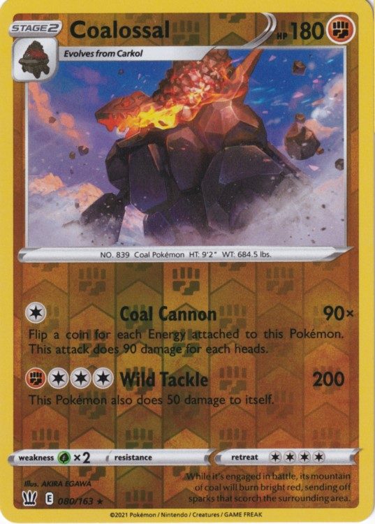 Coalossal er et Rare Holo Holo pokemon kort fra SWSH Battle Styles serien og har nummer 80/163.
