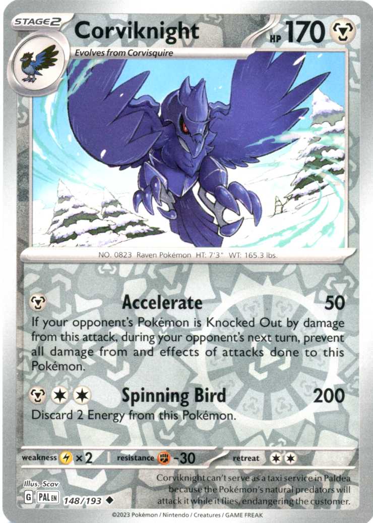 Corviknight er et Uncommon pokemon kort fra SV02 Paldea Evolved serien og har nummer 148/193.