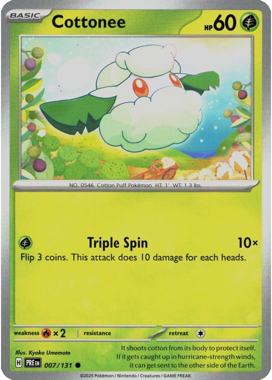 Cottonee er et Common pokemon kort fra SV08.5 Prismatic Evolutions serien og har nummer 7/131.