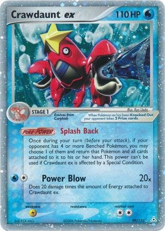 Once during your turn (before your attack), if your opponent has 4 or more Benched Pokémon, you may choose 1 of them and return that Pokémon and all cards attached to it to his or her hand. This power can’t be used if Crawdaunt ex is affected by a Special Condition.