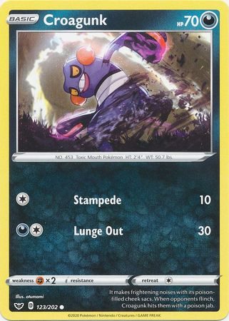 Croagunk er et Common pokemon kort fra Sword & Shield serien og har nummer 123/202.