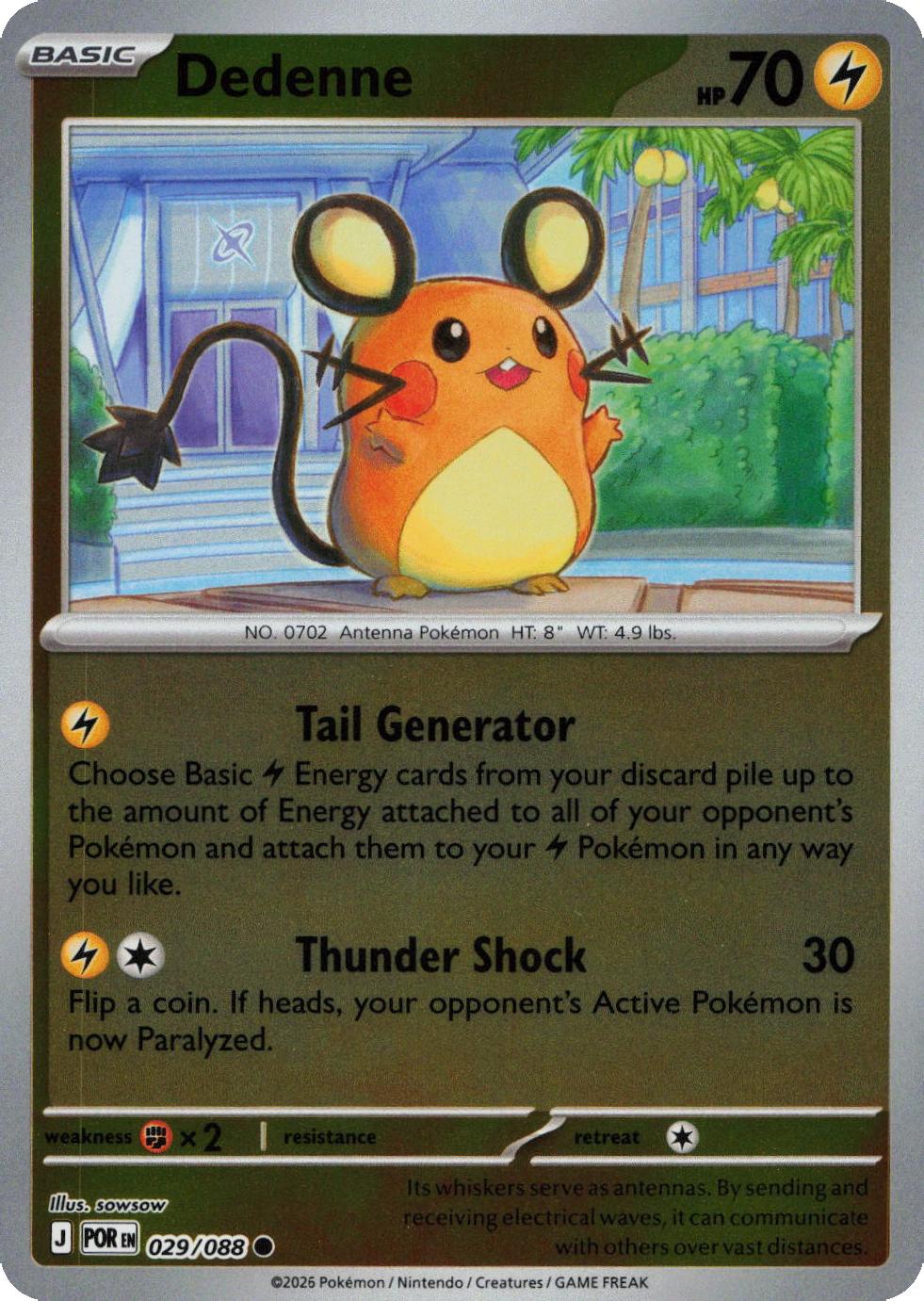 Dedenne er et Common pokemon kort fra ME03 Perfect Order serien og har nummer 29/088.