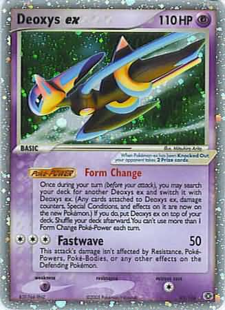 Once during your turn (before your attack), you may search your deck for another Deoxys ex and switch it with Deoxys ex. (Any cards attached to Deoxys ex, damage counters, Special Conditions, and effects on it are now on the new Pokémon.) If you do, put Deoxys ex on top of your deck. Shuffle your deck afterward. You can’t use more than 1 Form Change Poké-Power each turn.