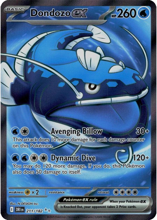 Dondozo ex er et Ultra Rare | Secret Rare ex (SV) pokemon kort fra SV10 Destined Rivals serien og har nummer 211/182.