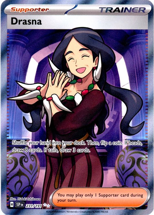 Drasna er et Ultra Rare | Secret Rare pokemon kort fra SV08 Surging Sparks serien og har nummer 231/191.
