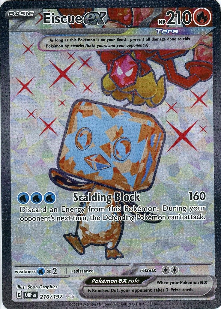Eiscue ex er et Ultra Rare | Secret Rare ex (SV) pokemon kort fra SV03 Obsidian Flames serien og har nummer 210/197.