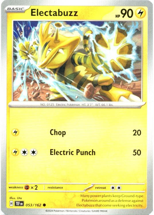 Electabuzz er et Common pokemon kort fra SV05 Temporal Forces serien og har nummer 53/162.