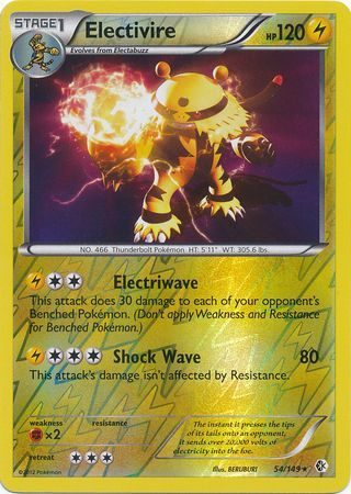 Electivire er et Rare Holo kort fra B&W Boundaries Crossed serien og har nummer 54/149.