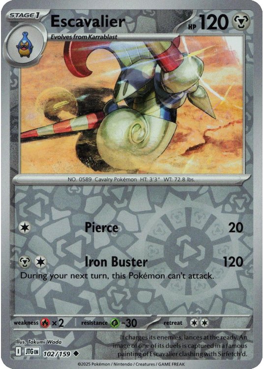 Escavalier er et Uncommon pokemon kort fra SV09 Journey Together serien og har nummer 102/159.