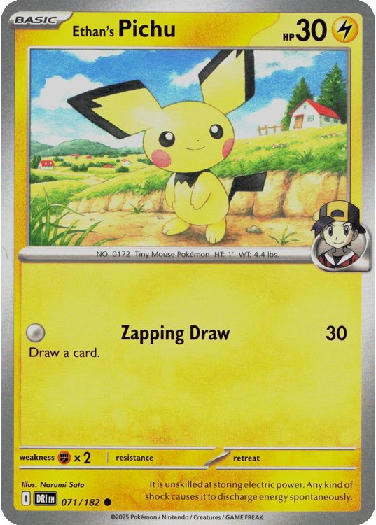 Ethan’s Pichu er et Common pokemon kort fra SV10 Destined Rivals serien og har nummer 71/182.