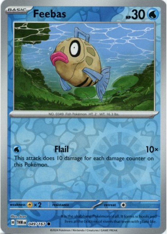 Feebas er et Common pokemon kort fra SV06 Twilight Masquerade serien og har nummer 49/167.