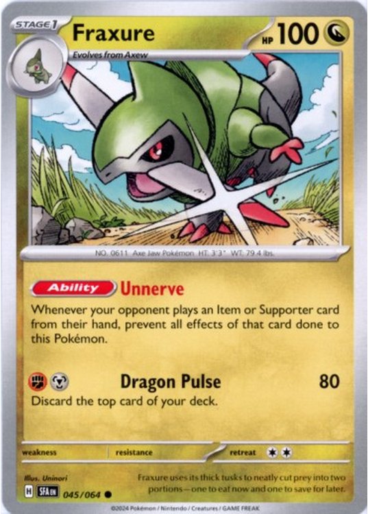 Fraxure er et Common pokemon kort fra SV06.5 Shrouded Fable serien og har nummer 45/064.