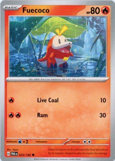 Fuecoco er et Common pokemon kort fra SV04 Paradox Rift serien og har nummer 23/182.