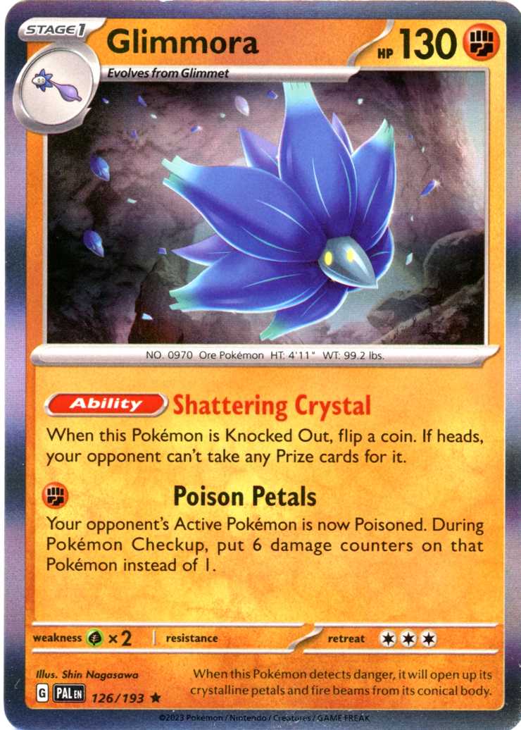 Glimmora er et Rare Holo Holo pokemon kort fra SV02 Paldea Evolved serien og har nummer 126/193.