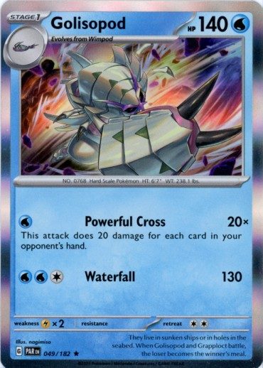 Golisopod er et Rare Holo pokemon kort fra SV04 Paradox Rift serien og har nummer 49/182.