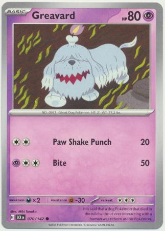 Greavard er et Common pokemon kort fra SV07 Stellar Crown serien og har nummer 70/142.