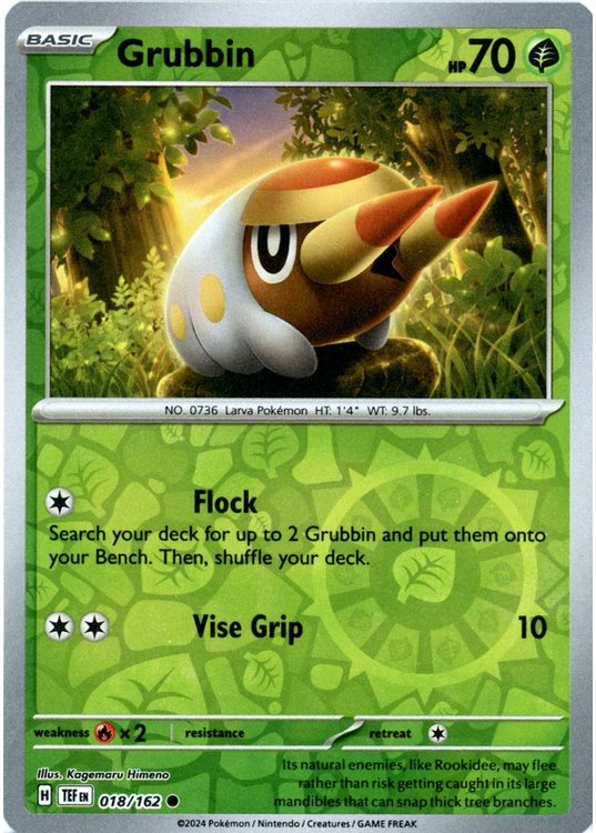 Grubbin er et Common pokemon kort fra SV05 Temporal Forces serien og har nummer 18/162.