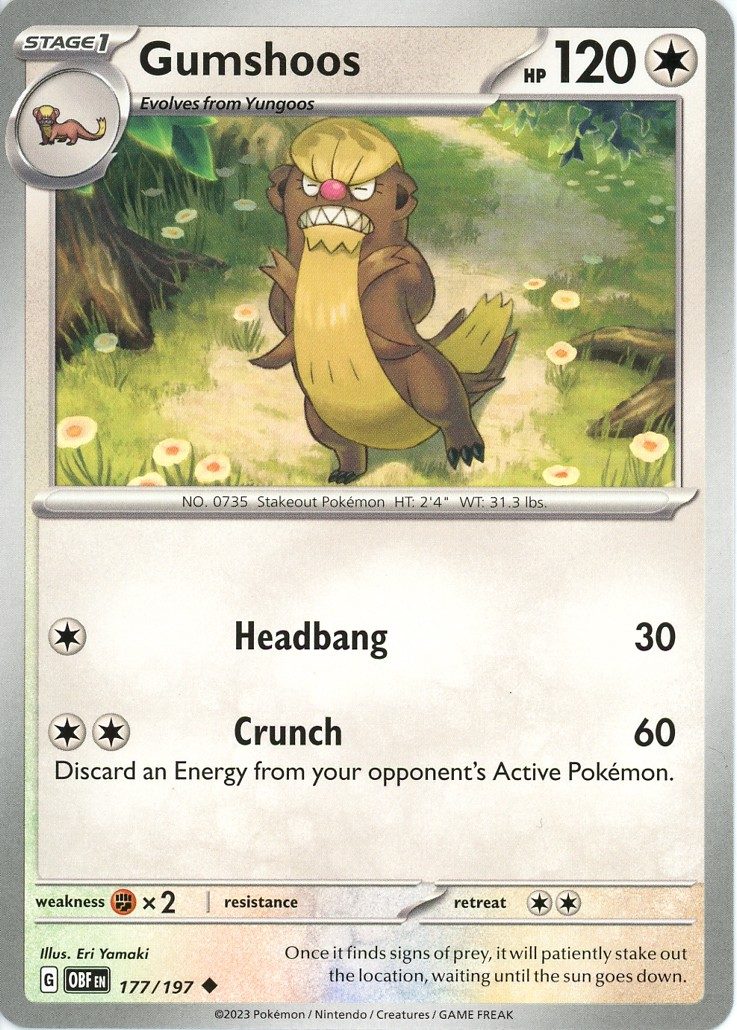 Gumshoos er et Uncommon pokemon kort fra SV03 Obsidian Flames serien og har nummer 177/197.