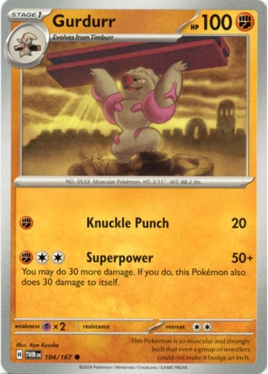 Gurdurr er et Common pokemon kort fra SV06 Twilight Masquerade serien og har nummer 104/167.