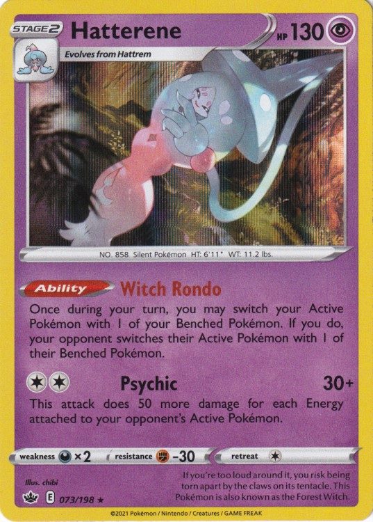 Hatterene er et Rare Holo Holo pokemon kort fra SWSH Chilling Reign serien og har nummer 73/198.