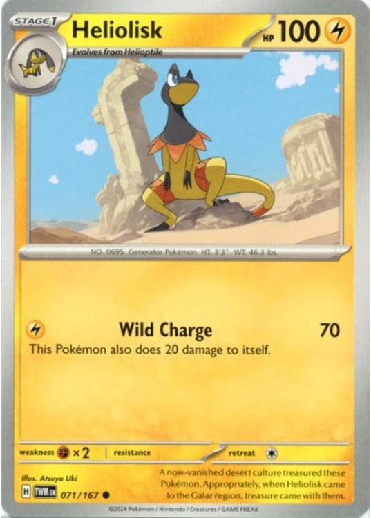 Heliolisk er et Common pokemon kort fra SV06 Twilight Masquerade serien og har nummer 71/167.