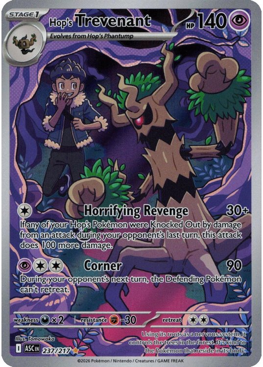 Hop’s Trevenant er et Illustration Rare | Secret Rare pokemon kort fra ME02.5 Ascended Heroes serien og har nummer 237/217.