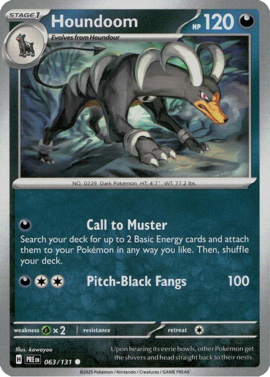 Houndoom er et Common pokemon kort fra SV08.5 Prismatic Evolutions serien og har nummer 63/131.