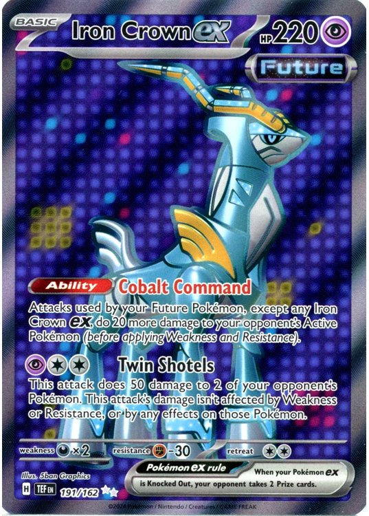 Iron Crown ex er et Ultra Rare | Secret Rare ex (SV) pokemon kort fra SV05 Temporal Forces serien og har nummer 191/162.