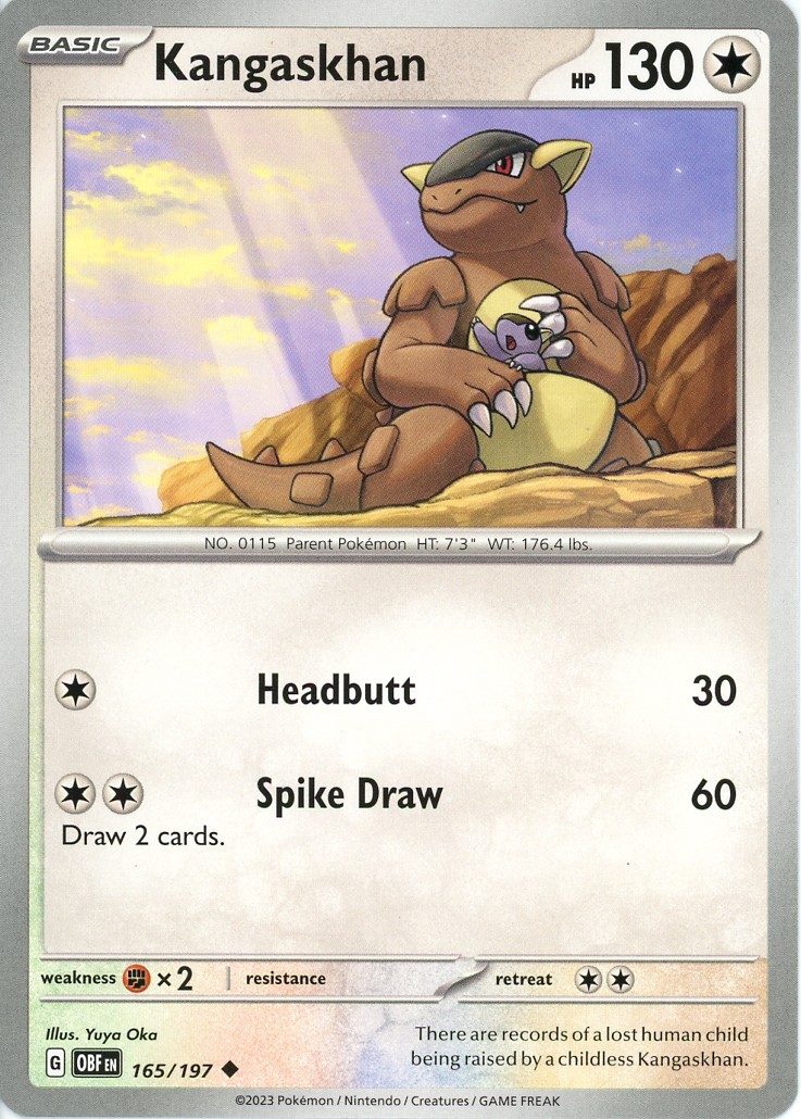 Kangaskhan er et Uncommon pokemon kort fra SV03 Obsidian Flames serien og har nummer 165/197.