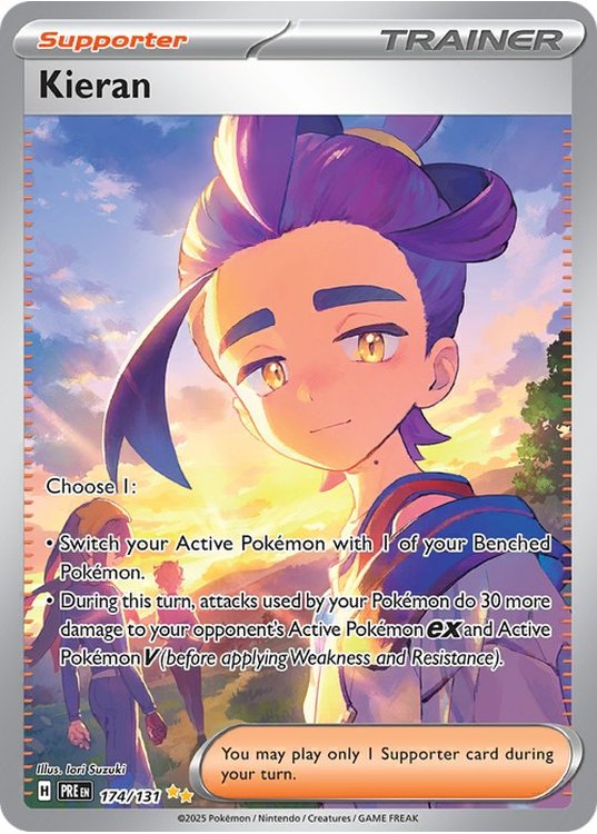 Kiernan er et Special Illustration Rare | Secret Rare pokemon kort fra SV08.5 Prismatic Evolutions serien og har nummer 174/131.