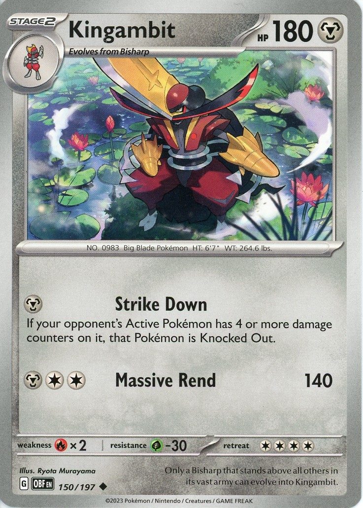 Kingambit er et Uncommon pokemon kort fra SV03 Obsidian Flames serien og har nummer 150/197.