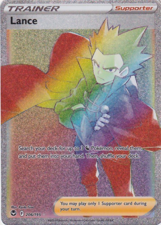 Lance er et Secret Rare pokemon kort fra SWSH Silver Tempest serien og har nummer 206/195.