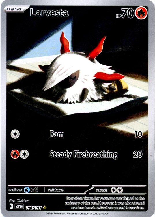 Larvesta er et Illustration Rare | Secret Rare pokemon kort fra SV08 Surging Sparks serien og har nummer 196/191.