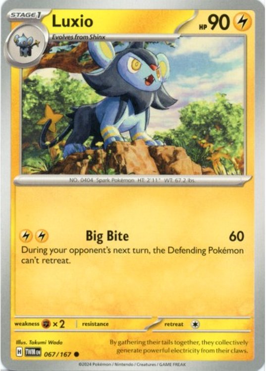 Luxio er et Common pokemon kort fra SV06 Twilight Masquerade serien og har nummer 67/167.