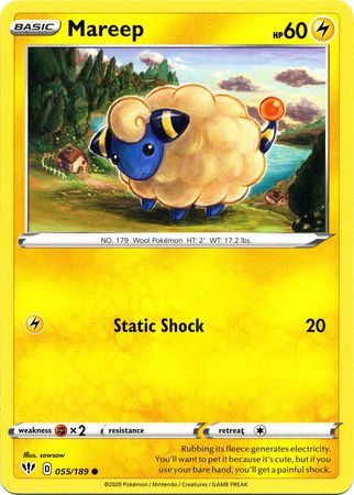 Mareep er et Common pokemon kort fra SWSH Darkness Ablaze serien og har nummer 55/189.