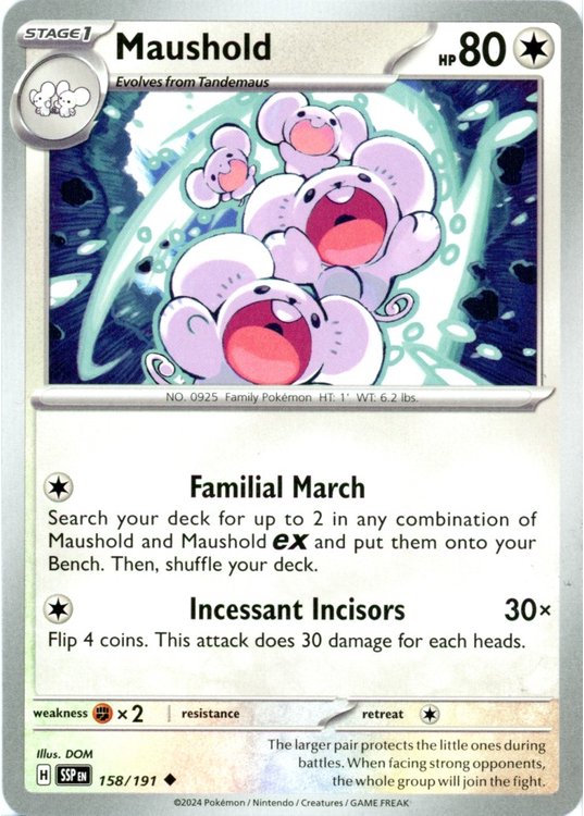 Search your deck for up to 2 in any combination of Maushold and Maushold ex and put them onto your Bench. Then, shuffle your deck.