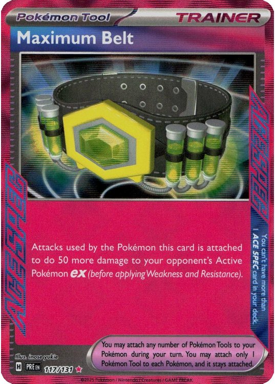 Maximum Belt er et Super Rare ACE SPEC pokemon kort fra SV08.5 Prismatic Evolutions serien og har nummer 117/131.