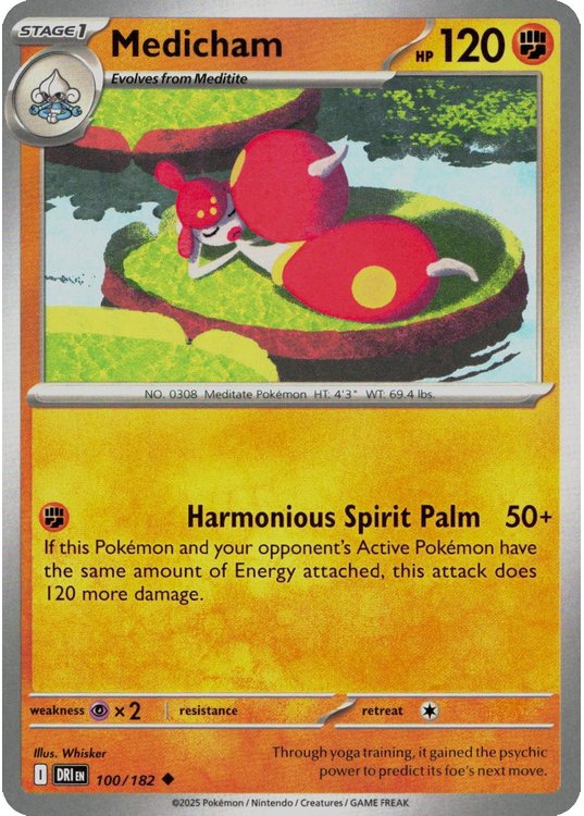 Medicham er et Uncommon pokemon kort fra SV10 Destined Rivals serien og har nummer 100/182.