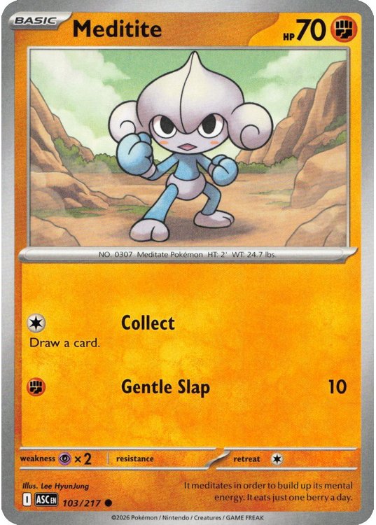 Meditite er et Common pokemon kort fra ME02.5 Ascended Heroes serien og har nummer 103/217.